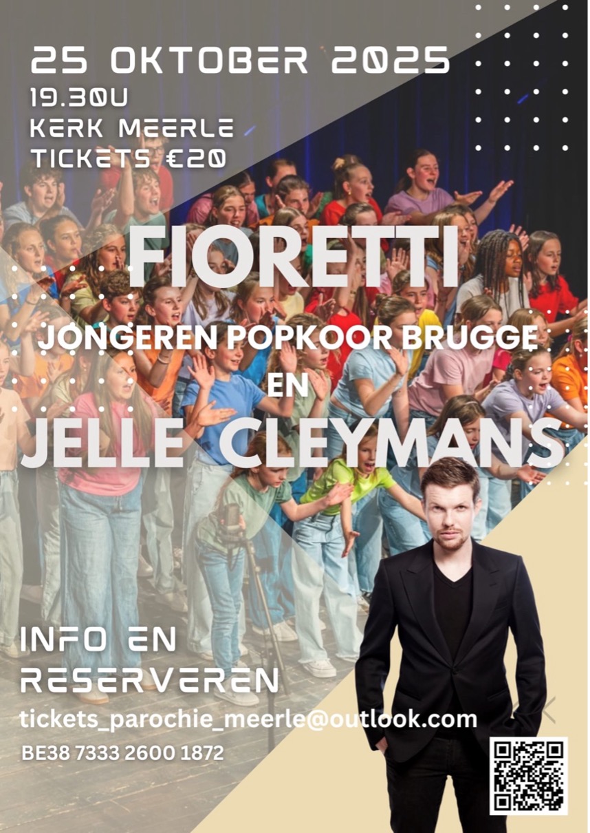 okt252025Kalender Kom en SPRING met ons de wereld in! 🎶 We zingen een concert met Jelle Cleymans.We brengen elk onze eigen nummers, maar zingen ook enkele nummers samen. Tickets: tickets_parochie_meerle@outlook.com